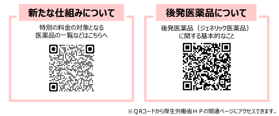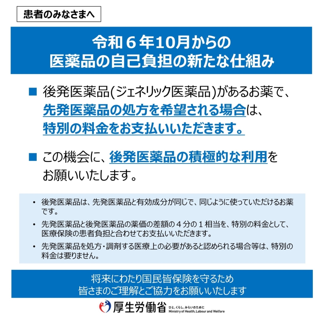 2024年10月より、ジェネリック医薬品(後発医薬品)がある薬に対して先発医薬品(長期収載品※)の使用を希望した場合、その薬の差額の4分の1とその消費税分を患者さまに「特別の料金」としてご負担いただく制度(長期収載品の処方等又は調剤に係る選定療養)が始まりました。