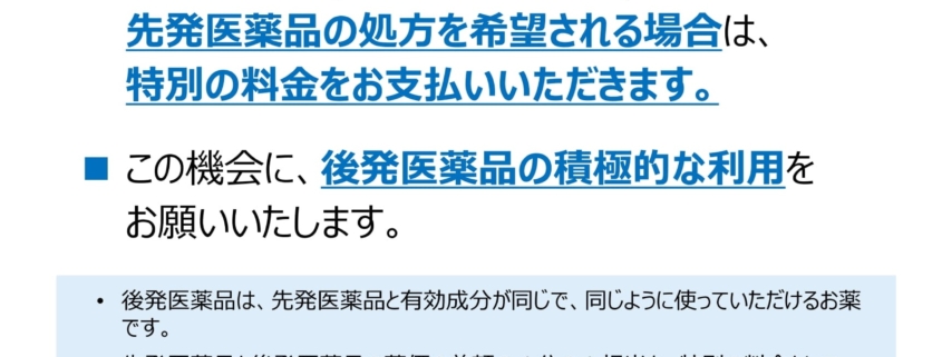 2024年10月より、ジェネリック医薬品(後発医薬品)がある薬に対して先発医薬品(長期収載品※)の使用を希望した場合、その薬の差額の4分の1とその消費税分を患者さまに「特別の料金」としてご負担いただく制度(長期収載品の処方等又は調剤に係る選定療養)が始まりました。